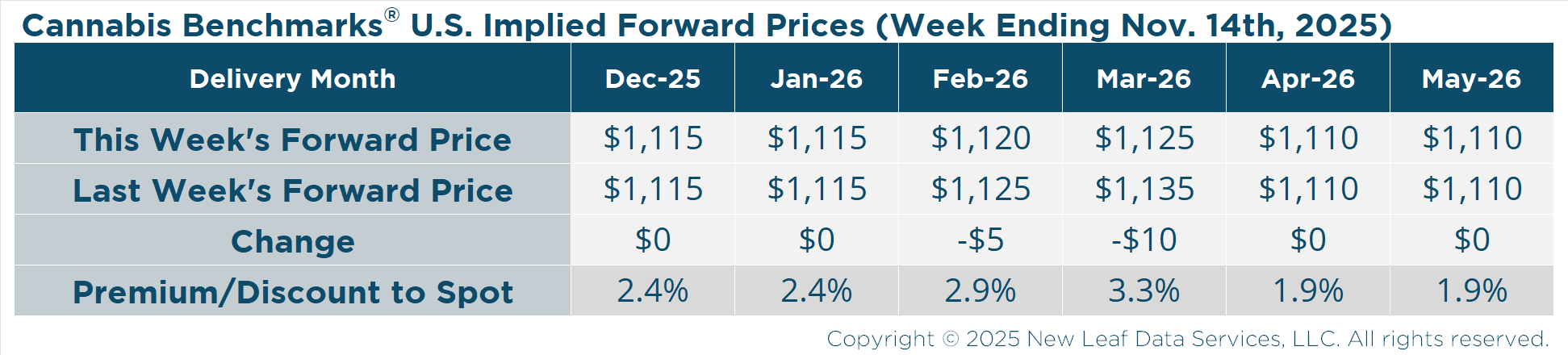 The U.S. Cannabis Spot Index decreased 2.8% to $1,089 per pound.